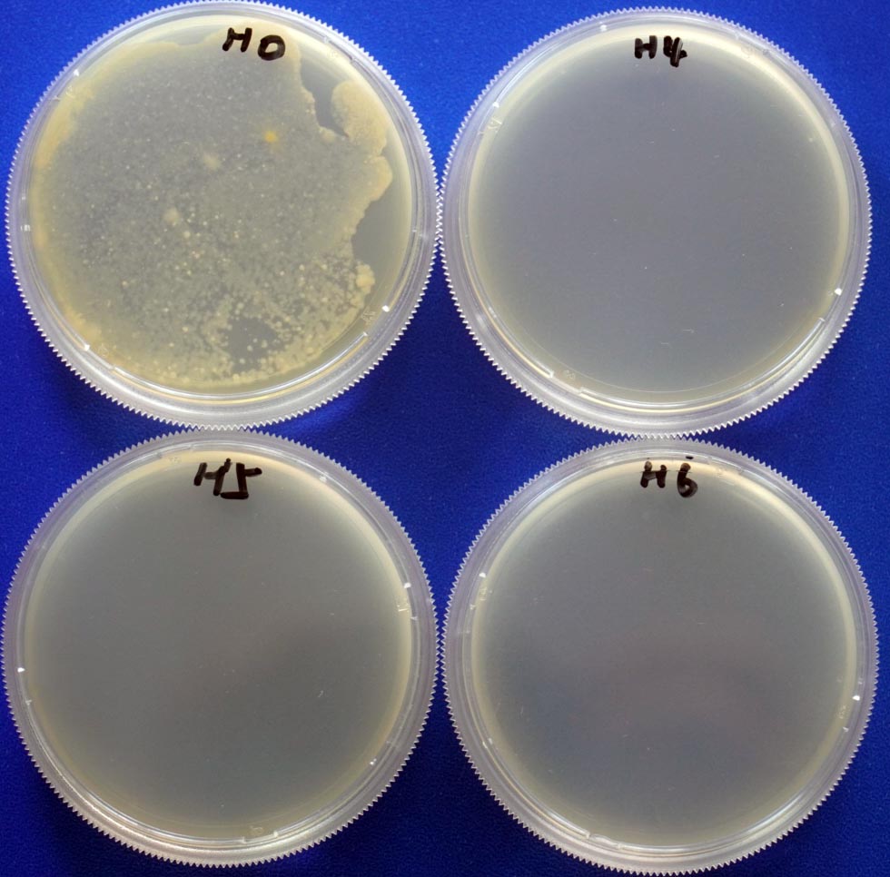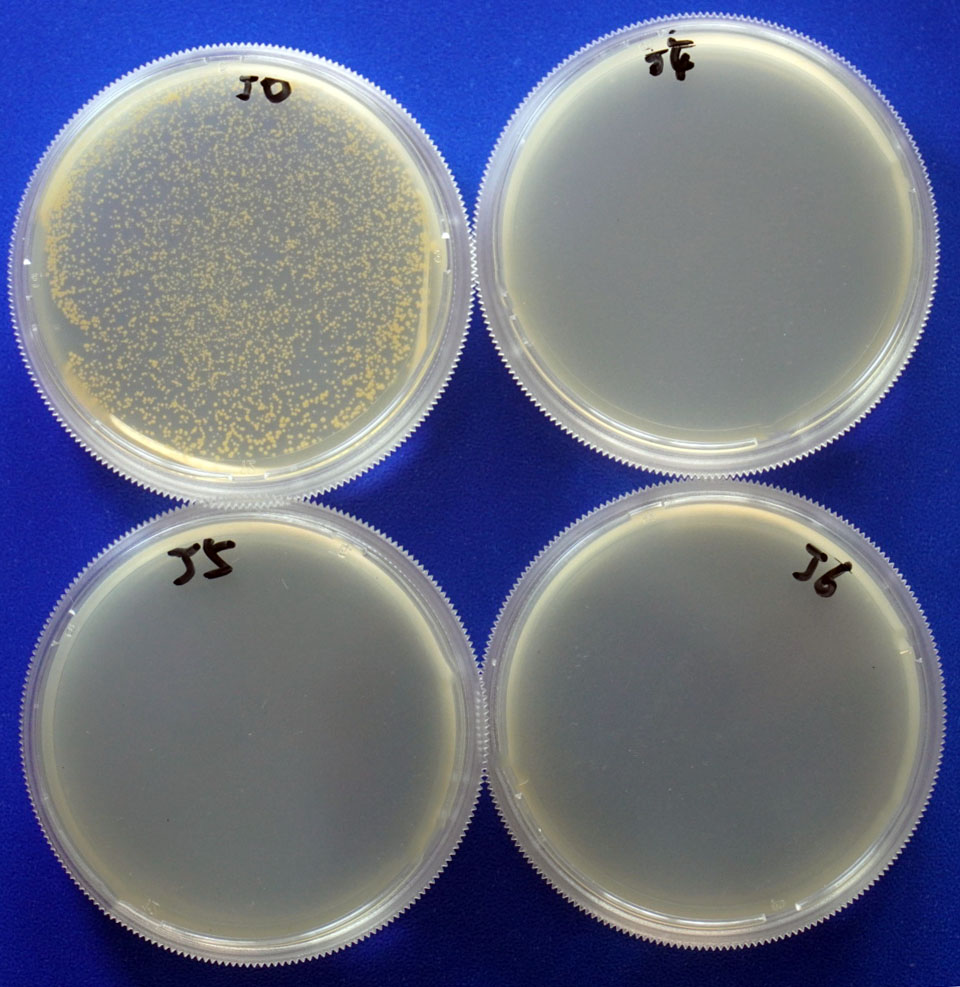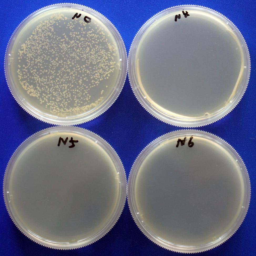 2.1. 对金黄色葡萄球菌的抑制效果(细菌) 培养基高压灭菌后,冷却并添加一定量的Buffpro 150后到平板。凝固后接种同样菌量的金黄色葡萄球菌,37℃培养18h。结果如下图: