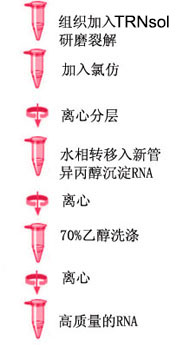 TRNsol是一种改进型一步法RNA抽提试剂盒。是基于异硫氰酸胍/苯酚法的一种即用的从细胞和组织中提取总RNA的试剂,在样品裂解或匀浆过程中,TRNsol可保持RNA完整性,同时裂解细胞,溶解细胞内含物。加入氯仿后,溶液分为水相、中间层和有机相,RNA在水相中。取出水相,用异丙醇可沉淀回收RNA;中间层用乙醇沉淀可回收DNA;有机相用异丙醇沉淀可回收蛋白。